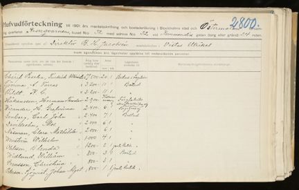 Förstorar du bild 2 ser du först rubriken: ”Hufvudförteckning till 1901 års mantalsskrivning och bostadsräkning i Stockholms stad och Östermalms församling, qvarteret Kronqvarnen, huset N:o 32, med adress N:o 32 vid Kommendörs – gatan (torg eller gränd) 24 roten". Sedan står: ”Ofvanstående egendom eges af: Direktör B. H. Jakobsén, mantalsskriven i ”Vistas utrikes” Därefter följer ett antal kolumner: ”Personernas namn (och, om de icke äro boende i egendomen, adress)”, ”Årlig hyra (verklig eller beräknad)”, ”Antal rum kök”, ”Lägenheten användes till”. Sedan står alla lägenhetsinnehavare uppräknade.