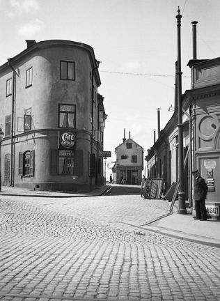 Gränd västerut från Östra Slussgatan mellan kv. Trehörningen (t.v.) och kv. Fiskarehuset. Kv. Järngraven Övra i fonden