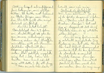 Nej, denna bok är ej till för att skrifva ned några politiska data uti. Många gånger har jag sökt nedskrifva "stora tilldragelser", men mitt tålamod räcker aldrig till. Vet du af, att det har förflutit tre hela månader sedan jag sist skref uti denna bok. Då var det februari, nu är det maj, den 5 maj.
