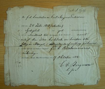 Tre dagar efter förhöret, den 7 september 1886, inkom ett intyg om att Eriksson äger god kristendomskunskap och åtnjuter medborgerligt förtroende från den Kungliga hovförsamlingen. Intyget är daterat 19 oktober 1882.