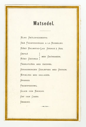 Följande inbjudan med program och matsedel ger en bild av hur högreståndspersoner roade sig under mitten av 1800-talet. Mycket möda lades ner på att utforma ett så vackert inbjudningskort som möjligt och ett musikprogram som var tilltalande för alla smaker.