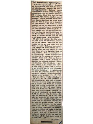 "Våra kvinnor ha alltid skrattat ett ondskefullt skratt, när från manligt håll den stora faran af deras hattnålar gång på gång predikats /.../ Men nu vilja vi säga ifrån, så att det hörs. Våra ögonläkare ha haft tillräckligt att göra med att utplåna följderna af detta slags olyckstillbud, och vi tolerar icke längre, att en daglig ögon- och lifsfara promenerar på våra gator och gör våra spårvagnar osäkra".