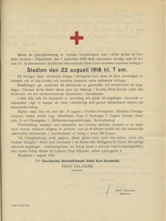 Efter en insamling under ett idrottsevenemang på Stadion den 22 augusti 1918 gick behållningen till utskick av 60 000 gymnastik- och idrottsböcker till krigsfångar i Europas länder. Krigsfångarna var från Amerika, Belgien, England, Frankrike, Tyskland och Österrike-Ungern. Det var en gåva och hälsning i Svenska Röda Korsets namn, från idrottsmän och den idrottsintresserade allmänheten i huvudstaden Stockholm.