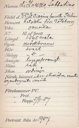 Han kallas omväxlande Sabbatino, Sabatino och Sabatini i olika myndighetspapper, men som musiker kallade han sig Sebastian di Zazzo. På baksidan av kortet har polisen fyllt i följande uppgifter om di Zazzo: