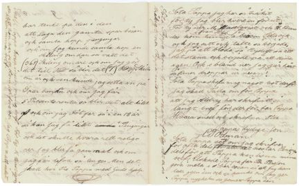Söta Pappa får jag tekna opp på en Pappers bit ner Jag går till Svanberga så får jag Pengar ner Pappa komer him och då leger jag dom i Spar bösan söta Pappa skrif svar i nesta Onsdag så Får jag underetelse om altihopa dom her sakerna det kom en Plup på paperet men jag kan ej förstå hur den har blifve, Falting måg har varitt her ock skure ut vår oxe, Ock med det sama köpte dom en Gamal hest som hvar rikligt grå så Gamal hvar han ock den Gaf dom (118) RD För det hvar den hesten som Herr Brandes hade till Telje.