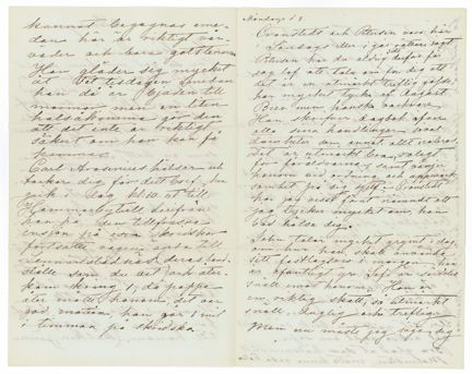 John talar mycket grymt i dag, om hur han skall använda sitt fastlagsris i morgon, han är ofantligt gr. Sofi är särdeles snäll emot honom. Hon är en riktig skatt, så utmärkt snäll, duglig och treflig. Men nu måste jag säga dig något annat, och det angående din skrifning. Det går ej an längre, du är verkligen för gammal att stafva så ytterligt illa, det är riktigt en skam för dig, du stafvar sämre än en kökspiga. du som ändå åtnjutit undervisning vid allment läroverk, ditt sista bref var nästan oläsligt. Det är verkligen en hederssak. Låt se att det blir förbättring dervidlag. Der du ej är säker så fråga. Kamraterna kuna troligtvis stafva rått, båda två, så de kunna nog hjelpa dig. Blif ej ledsen, utan ta i med kraft och god vilja. Jag undrar mycket hur du i öfrigt sköter om dig. Om du håller dig rikligt ren, om händer, tänder och i orönen. Är det godt om buk så är det väl också godt om såpa. Bra glad åt din hälsning till Malmsten, måtte denna goda hälsa få fortfara. Gud bevare dig min kära gosse