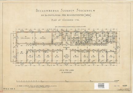Källa: Beckomberga sjukhus i Stockholm. Berättelse över sjukhusbygget avgiven av Sjukhusets byggnadskommitté i december 1937, tryckt i Stockholm 1938, s. 20.