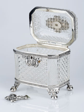 Sockerskrin i fasettmönstrat pressglas. Skrinet har ett låsbart lock upptill. Låset, liksom fötter och andra detaljer i silver.