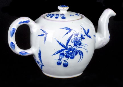 Tekanna med handmålad blå blomdekor mot vit botten. Kannan har en dämpad klotform och s-formad pip. Överst ett ovalt lock.