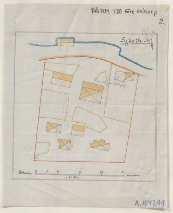 - Karta över hela fastigheten Sjövik Nr 1, med Fredrikssons tilltänkta utbyggnad i blyerts.