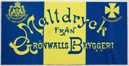 På etiketten står: Maltdryck från Grönwalls Bryggeri. Kongl. Hof Leveranstör.