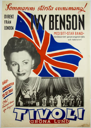 Affisch tryckt i rött, blått och svart med bild av ett ansikte, scen med männniskor på, Storbritanniens flagga samt text. På affischen står: Ivy Benson med sitt "Star Band". Sommarens största evenemang. Direkt från London. Gästkonserter 15-21 Juli. Obs! Endast dessa sju dagar. Tivoli Görna Lund.