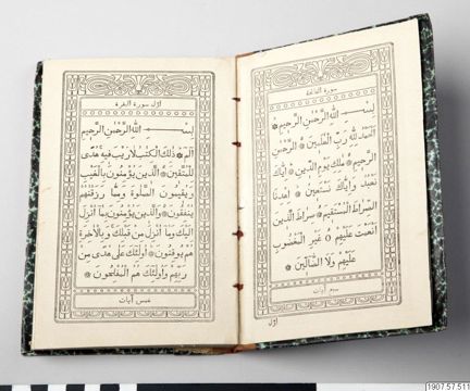 Bilderna visar en liten bok i läderband, med den första delen av Koranen tryckt på arabiska. Boken kommer ifrån Kashgar i Östturkestan (idag Xinjiang i Kina). Den har kommit till Sverige med Lars Erik Högberg (1858-1924), en svensk missionär som arbetade hela sitt liv för Missionsförbundet. Först var han tretton år i Ryssland, och sedan tjugotvå år i Kashgar.