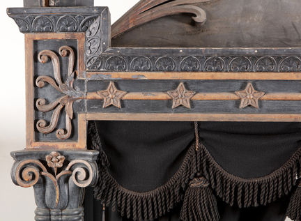 Begravningsvagnen är fem meter lång och nästan tre meter hög, med kuskbock och större bakhjul. Träet och draperierna runt båren, liksom de tofsar som hänger längs med överkanten, är svarta. Begravningsvagnens sidor pryds av blommande förgyllda kallor kring davidsstjärnan, den sexuddiga stjärna som varit symbol för judendomen sedan medeltiden. Kallan kan symbolisera renhet, återfödelse och hängivenhet (Bild 2, 3 och 6).