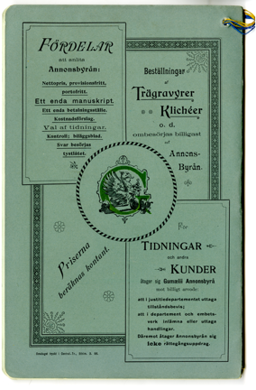 Fram- och baksida på Skandinavisk annonstaxa från S. Gumaeli annonsbyrå nr 1 1896.
