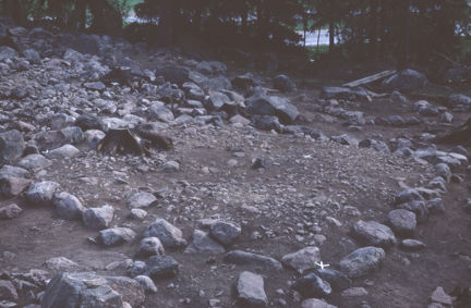 Stensättning, kvadratisk, 7,5 meter stor och 0,4 meter hög, med tydligt lagd kantkedja bestående av 0,3-0,8 meter stora stenar. Anläggningen var uppbyggd av 0,05-0,2 meter stora stenar lagda i 2-3 skikt med fyllning av mylla. Botten utgjordes av lerblandad pinnmo. I den SO delen av anläggningen påträffades ett 5 x 5,5 meter stort och 0,2 meter tjockt lager av mörk, sotblandad mylla som innehöll en järnkniv, keramik, en knacksten, bränd lera och kol.