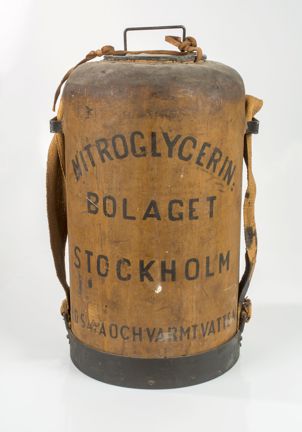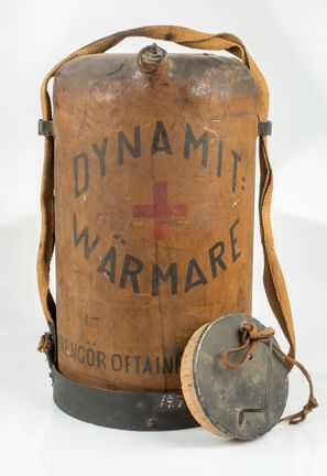 På dynamitvärmaren står målat ”Dynamitwärmare. Nitroglycerinbolaget Stockholm. Rengör ofta innerkärlet med såpa och varmt vatten.”