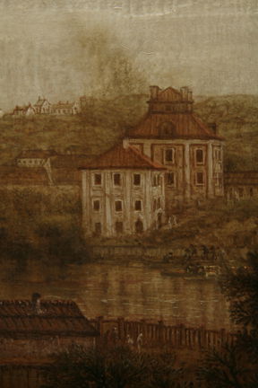 Tvärsöver Blekholmen löper Gamla Kungsholmsbrogatan. Den gick mellan Kungsholmen och Norrmalm via Blekholmen. Byggnaden längst till höger i utsikten är Serafimerlasarettet. Det var tidigare en malmgård men byggdes successivt om och byggdes ut under 1700-talets andra hälft. Balkom malmgården ligger Skinnarviksbergen. De vita husen längst till höger är Riddarholmen.