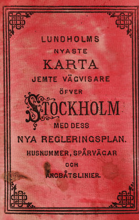 Lundholms senaste karta jemte vägvisare öfver Stockholm med dess nya regleringsplan. Husnummer, spårvägar och ångbåtslinjer finns med på kartan.